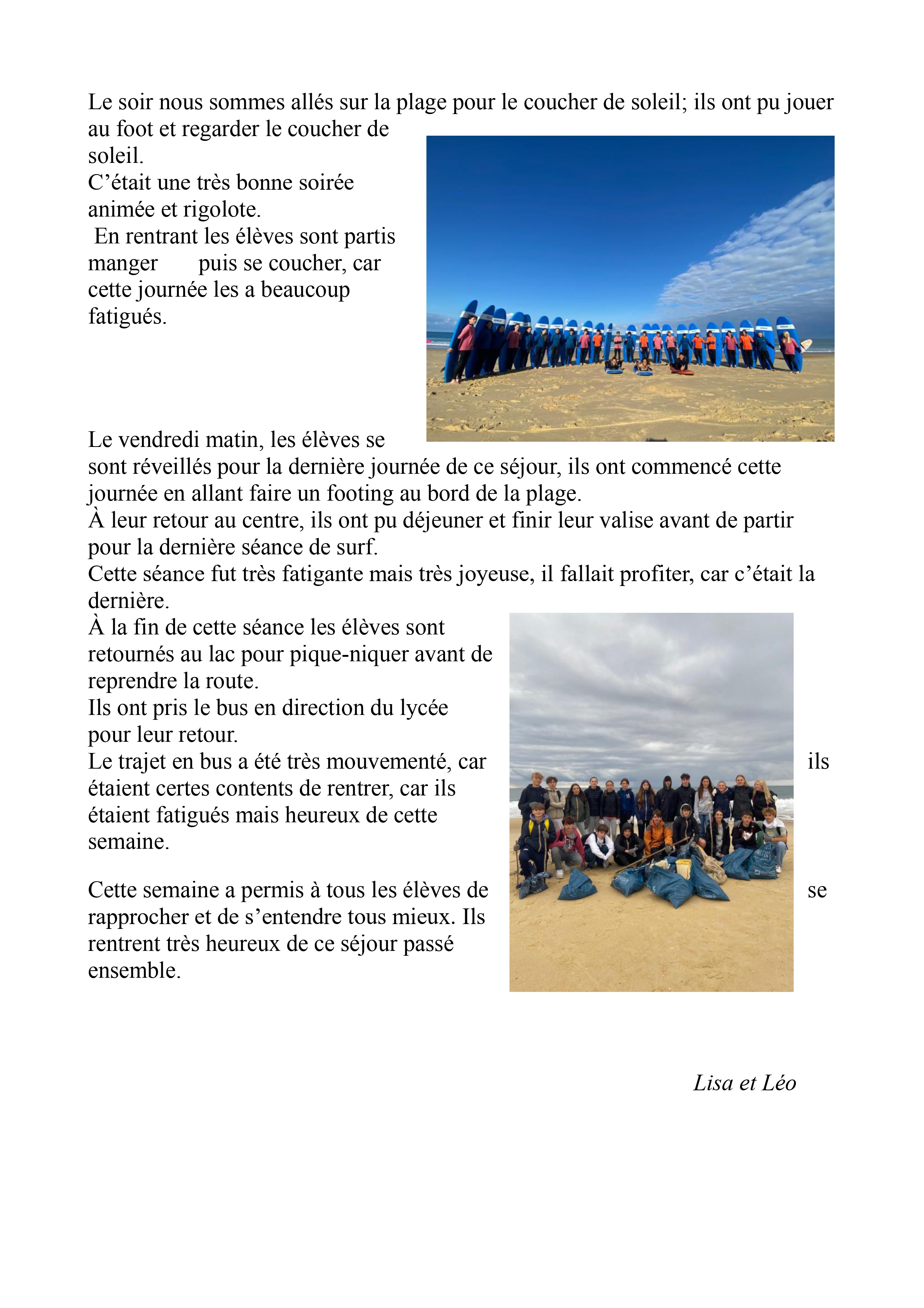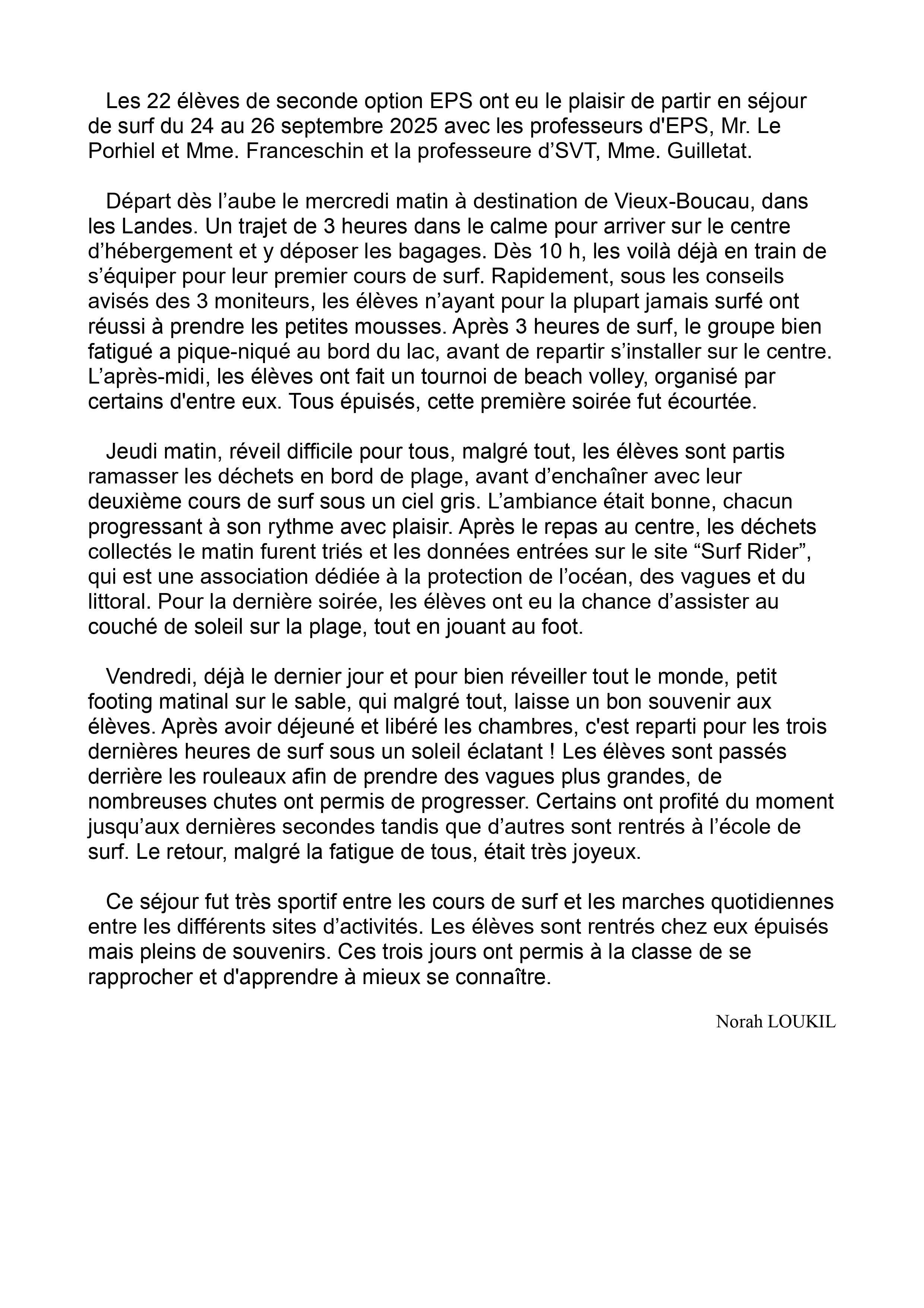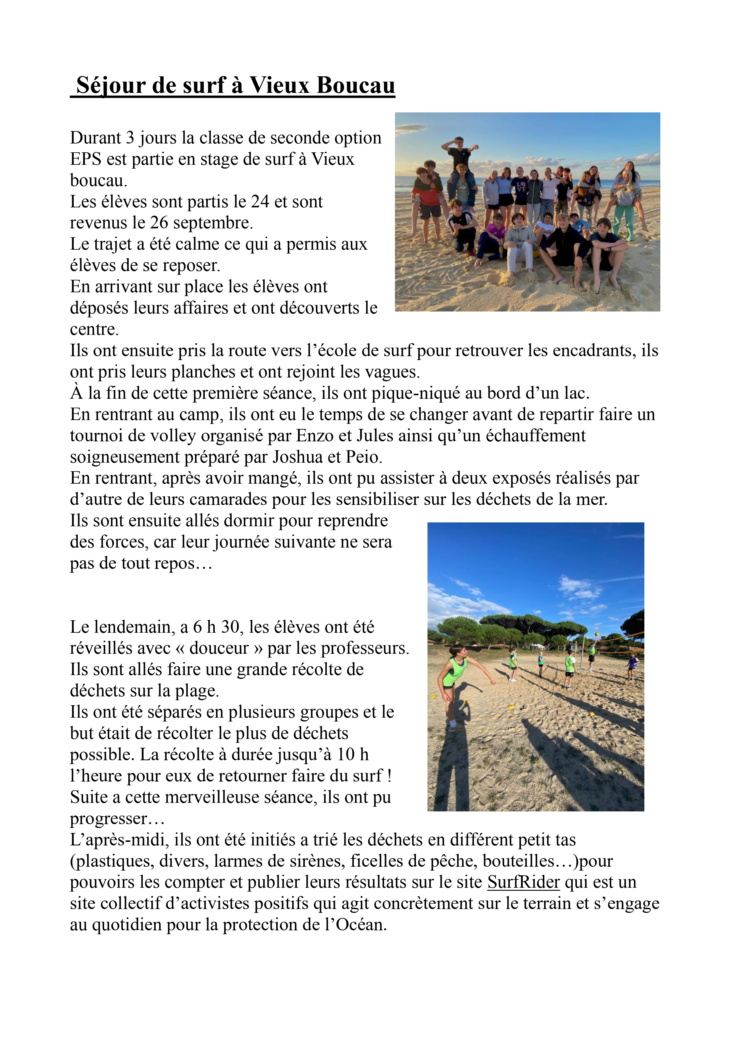 Pendant trois jours, les élèves de la classe de seconde option EPS sont partis à Vieux-Boucau en sejour surf. En plus du surf il y eu du footing, du beach volley, et une collecte de déchets sur la plage. Ce séjour c’est très bien passé. Il a permis aux élèves d’apprendre à se connaître et de se rapprocher. Les élèves rentrent fatigués mais très content de ce séjour.