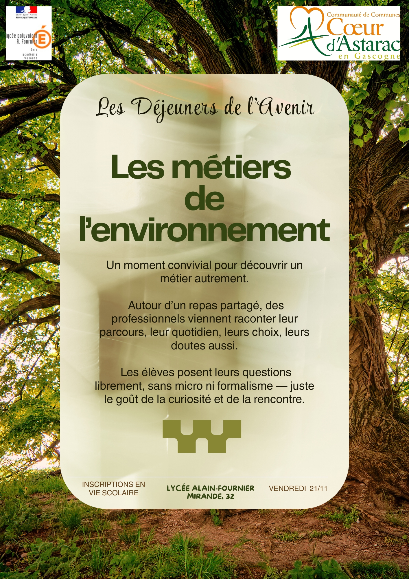 Vendredi 21 novembre dernier, le lycée de Mirande a lancé avec succès la première édition de son Déjeuner de l’Avenir, un événement conçu pour favoriser les échanges directs entre élèves et professionnels. Organisé en partenariat avec la Communauté de Communes du Cœur d’Astarac, ce premier rendez-vous était dédié aux métiers de l’environnement.