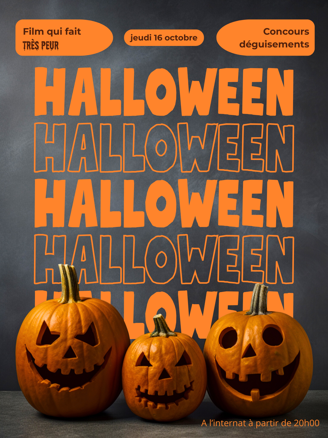 Jeudi 16 octobre, la soirée débutera par un repas thématique aux couleurs d’Halloween. Après le dîner, place à un film qui fait frissonner et à un concours de déguisements pour récompenser les costumes les plus originaux.